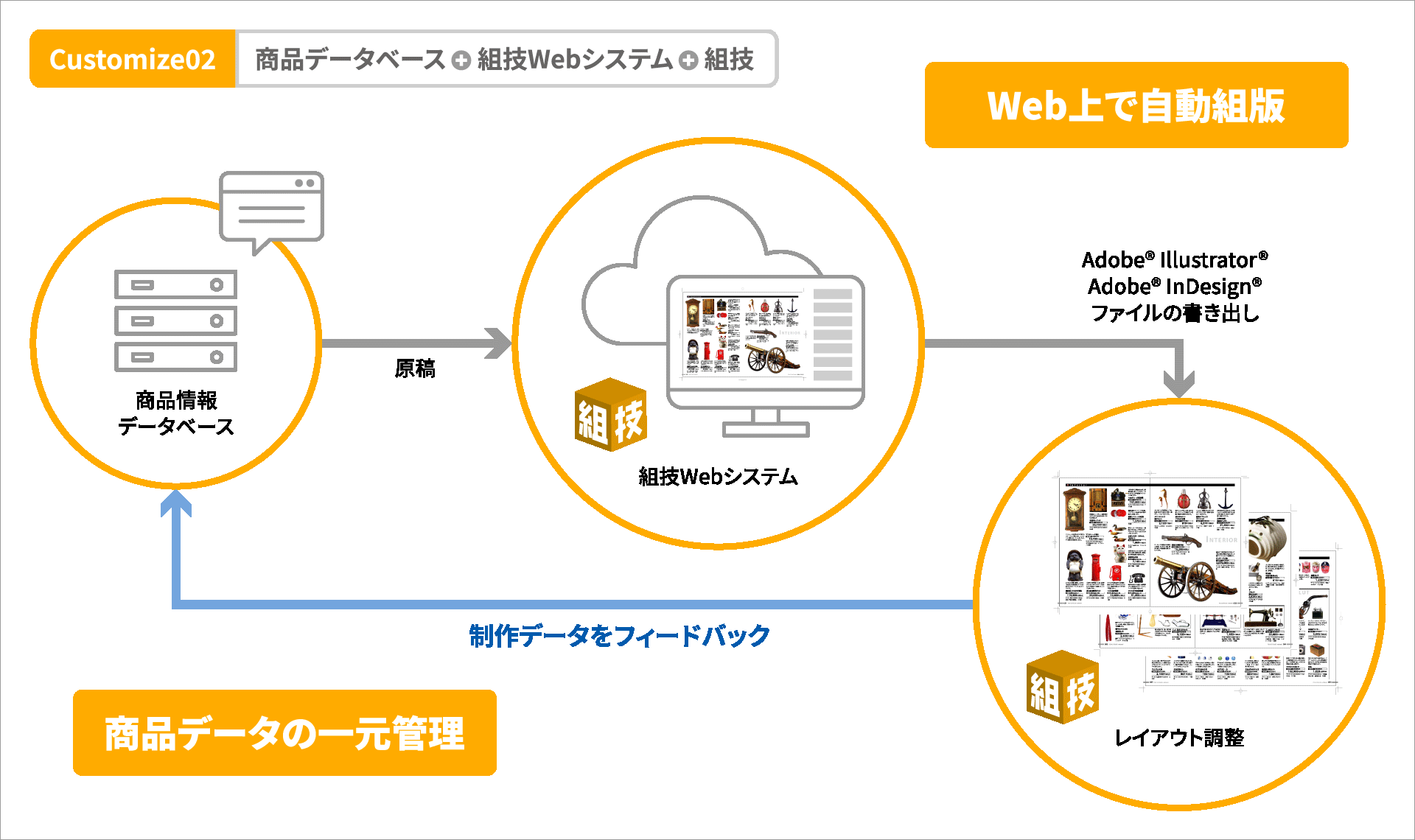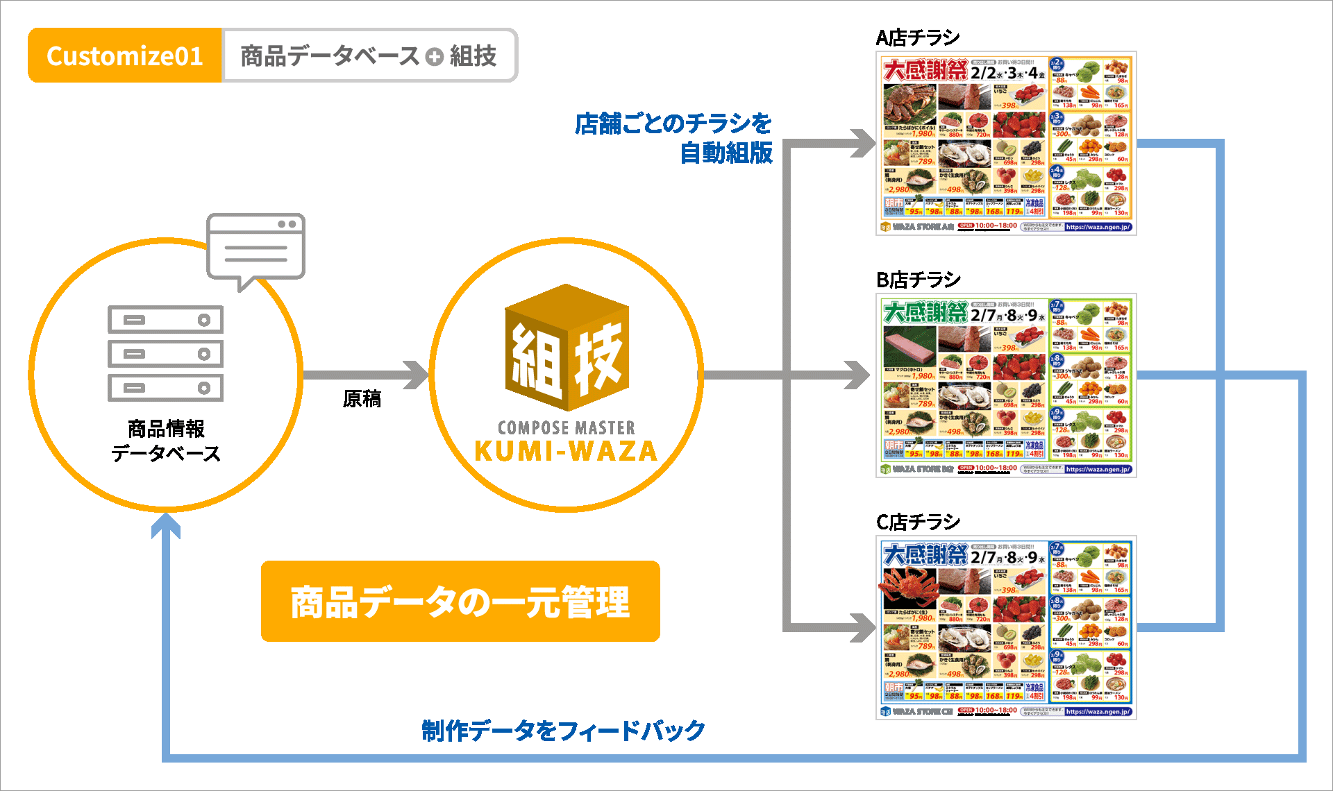 「組技」をベースとした自動組版システムを、チラシやカタログ制作など業務内容にあわせて柔軟にカスタマイズできます。 当社の強みであるシステム構築力を活かし、商品情報を一元管理し、効率的な制作フローを実現します。カスタマイズをご希望のお客様は、ページ下部の「お問い合わせ」からご連絡をお願いします。